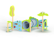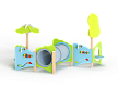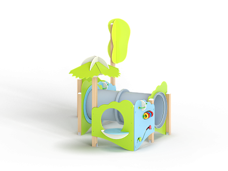 Лабиринт состоит из столбов и крепящихся к ним фанерных стенок с игровым оборудованием в виде мишеней, головоломок, детских счет, трубы-перехода пластиковой и фанерных столиков. На двух столбах установлены две декоративные фанерные крыши в форме кроны дерева и пальмы.