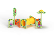 Лабиринт состоит из столбов и крепящихся к ним фанерных стенок с игровым оборудованием в виде мишеней, головоломок, детских счет, трубы-перехода пластиковой и фанерных столиков. На двух столбах установлены две декоративные фанерные крыши в форме кроны дерева и пальмы с художественным оформлением в виде тропических птиц.