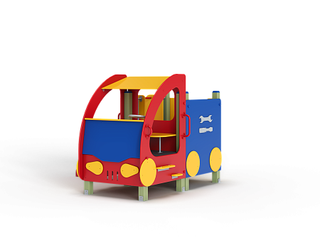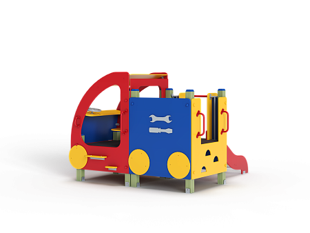 Машина выполнена из фанерных элементов в виде кабины и кузова.  Кабина имеет вход с двух сторон, по две ступеньки и по две ручки с каждой стороны, вращающийся руль и сидение. Кузов - открытая площадка со входом в виде альпинистской стенки и горкой. На бортах кузова прикреплены декоративные элементы в виде слесарных инструментов.