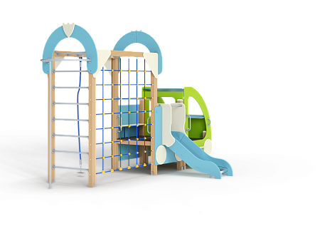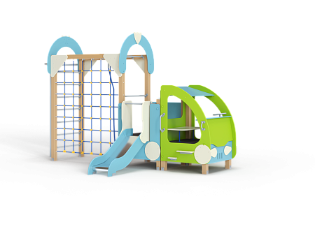 Пожарная машина состоит из кабины, кузова, горки и вынесенного спортивного комплекса. Вынесенный спортивный комплекс состоит из шеста, каната, шведской стенки, рукохода, сетки полипропиленовой для лазания и фанерных декоративных элементов. Кабина имеет вход с двух сторон, по две ступеньки и по две ручки с каждой стороны, вращающийся руль и сидение. Кузов - открытая площадка имеет один вход и горку. Один борт имеет художественно оформленную поверхность в тематике экстренных служб.