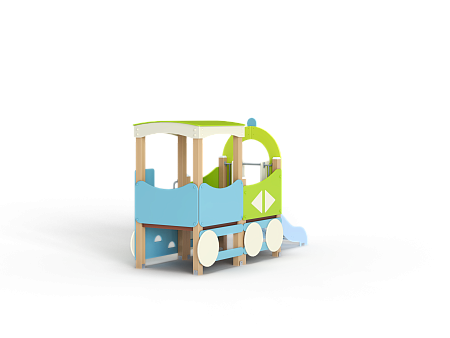 Паровозик состоит из кабины с крышей и котла с горкой. Кабина имеет вход в виде альпинистской стенки и две вспомогательные ручки, фанерное ограждение и крыша. Котел - открытая площадка с горкой, декоративной аркой и фанерным ограждением с художественным оформлением. Снизу по бокам расположены декоративные колеса.