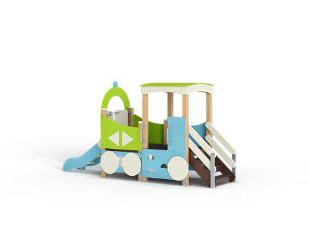 Паровозик состоит из кабины с крышей и лестницей, котла с горкой. Кабина имеет вход в виде альпинистской стенки и лестницы, две вспомогательные ручки, фанерное ограждение и крышу. Котел - открытая площадка с горкой, декоративной аркой и фанерным ограждением с художественным оформлением. Снизу по бокам расположены декоративные колеса.