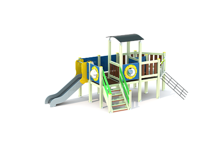 Комплекс скомпонован в форме кораблика с башней, на которой установлены лестница, горка, ограждение, сетка и крыша. Детали кораблика изготовлены из HPL пластика, тщательно отшлифованного бруса и металлических элементов из стали с оцинкованным покрытием, навес крыши изготовлен из экструдированного высокомолекулярного полиэтилена. Оцинковка металла производится методом электрохимической гальванизации. Скат горки изготовлен из нержавеющей стали. Сетка изготовлена из многожильного армированного износостойкого каната.