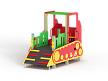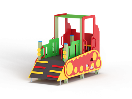 Бульдозер состоит из крыши, ограждений в виде деталей бульдозера, трапа, ручек, лавочки и декоративных элементов.