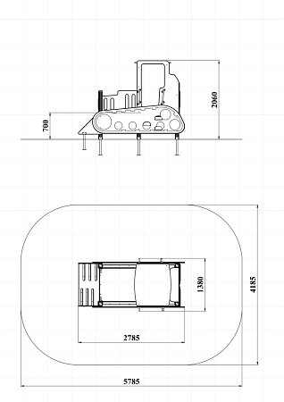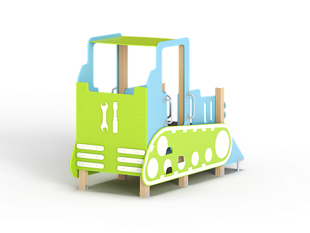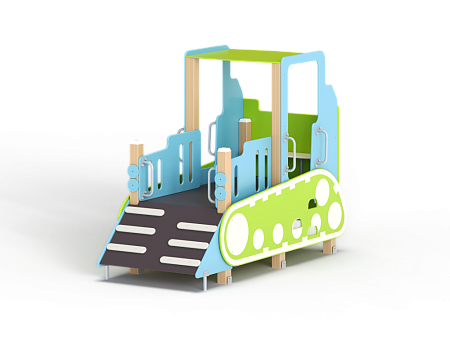 Бульдозер состоит из крыши, ограждений в виде деталей бульдозера, трапа, ручек, лавочки и декоративных элементов.