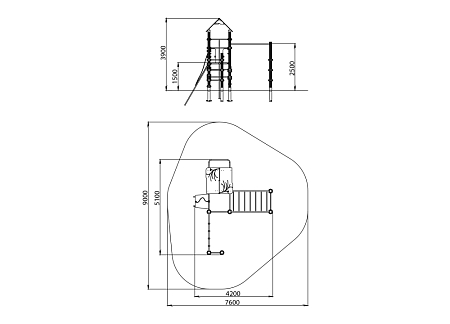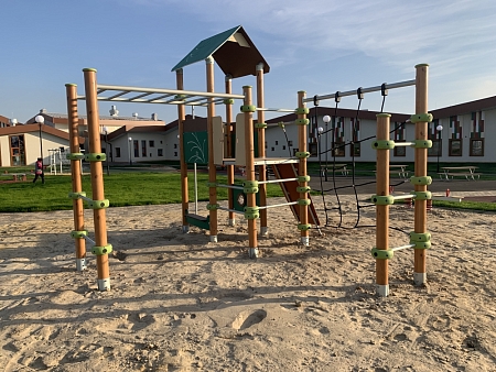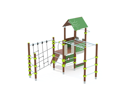 Универсальный комплекс состоит из четырех башен с площадками, соединенных между собой сеткой, радиусным мостом и подвесным мостом. На трех башнях установлена крыша. Столбы башен выполнены из клееной древесины диаметром 125 мм. Все металлические гимнастические элементы выполнены из стали с оцинкованным покрытием, с антивандальными и безопасными соединениями между собой. Оцинковка металла производится методом электрохимической гальванизации. Скат горки выполнен из нержавеющей стали. Сетки и канаты изготовлены из многожильного армированного износостойкого каната. Площадка радиусного моста и ступени подвесного моста выполнены из экструдированного высокомолекулярного полиэтилена. Площадки башен, ограждения башен, борта и ограждения горки выполнены из HPL пластика.