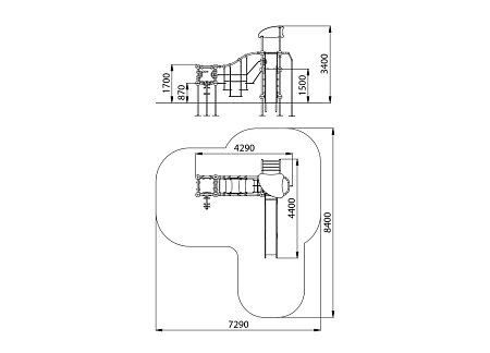 Универсальный комплекс состоит из гимнастического оборудования и двух башен с площадками, соединенных подвесным переходом. Одна башня с крышей, ручками и горкой, вторая башня с ограждением и ручками. Все металлические элементы башен и гимнастического оборудования выполнены из стали с оцинкованным покрытием, с антивандальными и безопасными соединениями между собой. Оцинковка металла производится методом электрохимической гальванизации. Скат горки выпонен из нержавеющей стали. Площадки, стенки, крыша, ручки, борта и ограждения горки выполнены из HPL пластика. Сетки и канаты изготовлены из многожильного армированного износостойкого каната