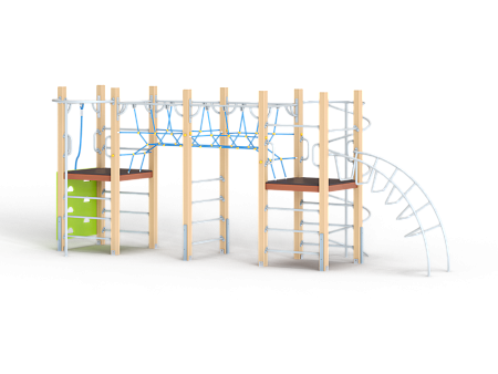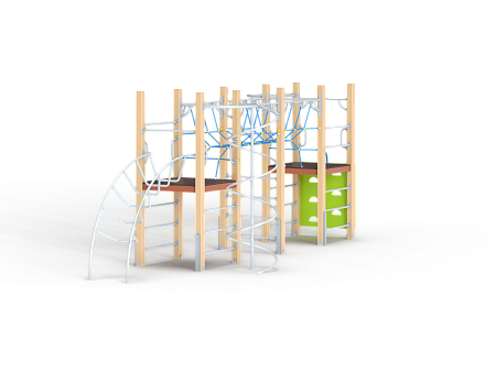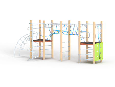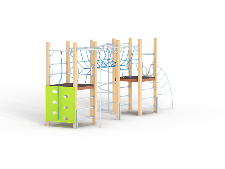 Спортивный комплекс сосоит из двух башен соединенных вертикальной сеткой полипропиленовой. На башнях установлены перекладины усиленные, лиана, шест, шест спираль, перекладины, ручки вспомогательные, альпинистская стенка и перекладина с канатом.