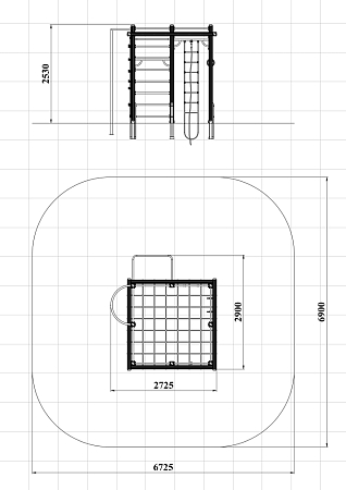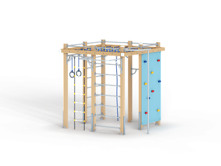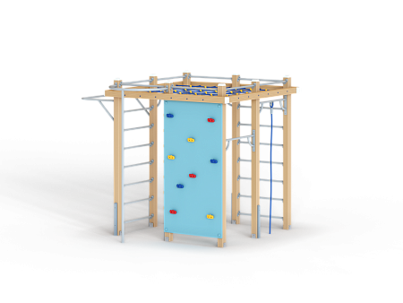 Спортивный комплекс оборудован вертикальной полипропиленовой сеткой, шестом, шведскими стенками, кольцам гимнастическими, полипропиленовой лестницей, канатом, перекладинами, фанерной стенкой с альпинистскими камнями и приставным турником