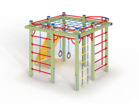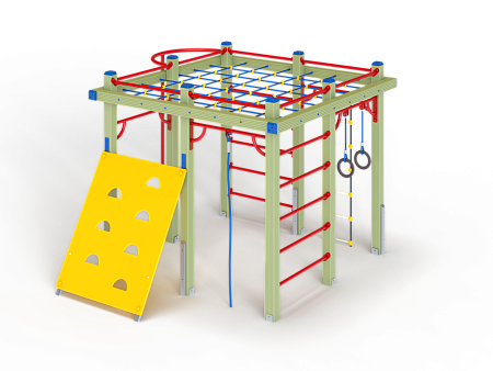 Спортивный комплекс оборудован сеткой полипропиленовой горизонтальной, шестом, шведскими стенками, альпинисткой стенкой наклонной, кольцам гимнастическими, лестницей полипропиленовой и канатом.