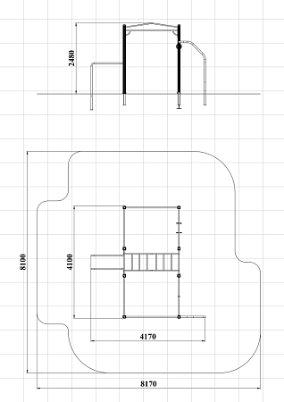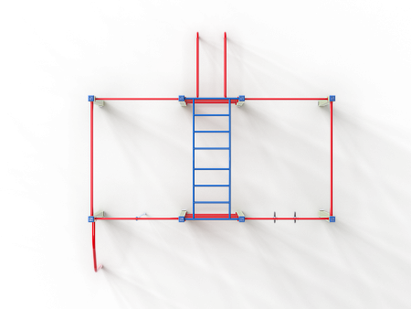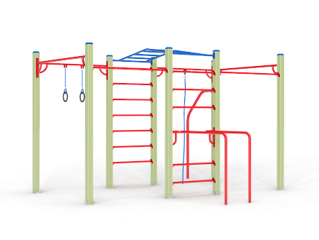 Спортивный комплекс оборудован рукоходом изогнутым, шведскими стенками, брусьями изогнутыми, кольцам гимнастическими, канатом, перекладинами, стойкой упорной.