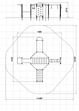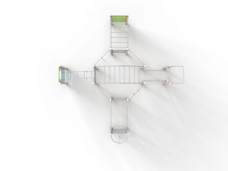 Спортивный комплекс оборудован рукоходом, рукоходом изогнутым, рукоходом с гимнастическими кольцами, шведскими стенками, брусьями межстолбовыми, кольцам гимнастическими, канатом, шестом, перекладинами, альписнистскими стенками, фанерной стенкой с круглым вырезом, ручкам вспомогательными и турником приставным.