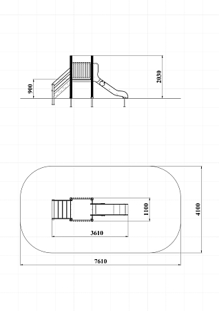 Комплекс состоит из башни с горкой с высотой ската 900 мм, лестницы и двух металлических ограждений