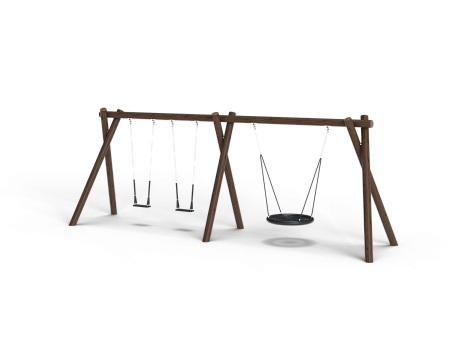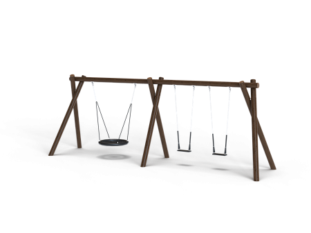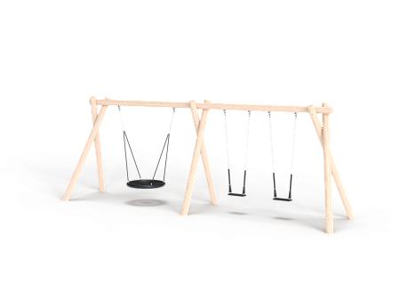 Качели двойные для подвеса гнездо и двух сидений выполнены из восьми брёвен. Брёвна выполнены из лиственницы, имеют естественную природную форму, тщательно отшлифованы и обладают высочайшей прочностью. Брёвна покрыты в три слоя специальной пропиткой финского производства, содержащую антисептики и обеспечивающую ультрафиолетовую защиту от солнечного воздействия. Сетка подвеса гнездо изготовлена из многожильного армированного износостойкого каната.