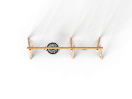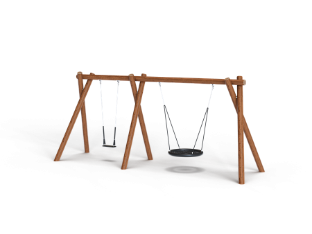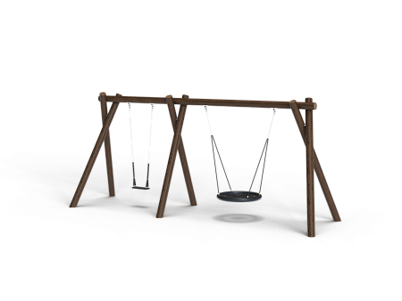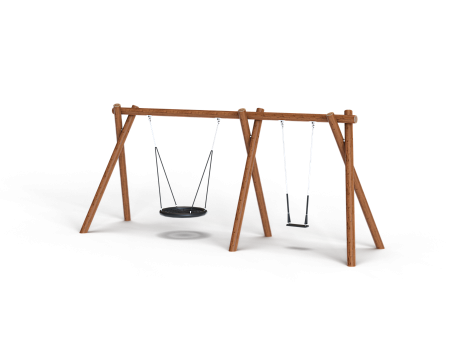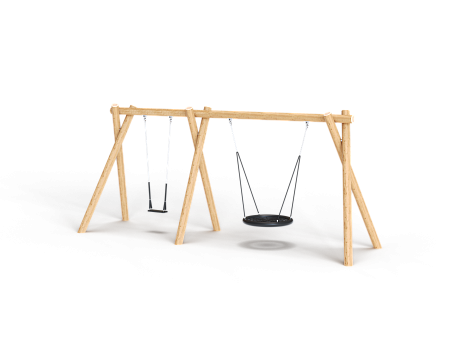 Качели двойные для подвеса гнездо и двух сидений выполнены из восьми брёвен. Брёвна выполнены из лиственницы, имеют естественную природную форму, тщательно отшлифованы и обладают высочайшей прочностью. Брёвна покрыты в три слоя специальной пропиткой финского производства, содержащую антисептики и обеспечивающую ультрафиолетовую защиту от солнечного воздействия. Сетка подвеса гнездо изготовлена из многожильного армированного износостойкого каната.