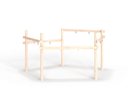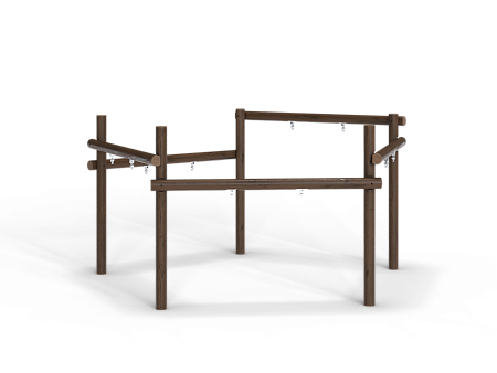 Рама качелей для пяти сидений выполнена из десяти бревен обвязанных в виде пятиугольника. Брёвна выполнены из лиственницы, имеют естественную природную форму, тщательно отшлифованы и обладают высочайшей прочностью. Брёвна покрыты в три слоя специальной пропиткой финского производства, содержащую антисептики и обеспечивающую ультрафиолетовую защиту от солнечного воздействия.