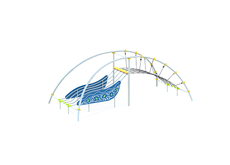 Металические элементы каркаса комплекса выполнены из стали с оцинкованным покрытием, с антивандальными и безопасными соединениями между собой. Оцинковка металла производится методом электрохимической гальванизации. Сетки и канаты изготовлены из многожильного армированного износостойкого каната. Стенки выполнены из экструдированного высокомолекулярного полиэтилена.