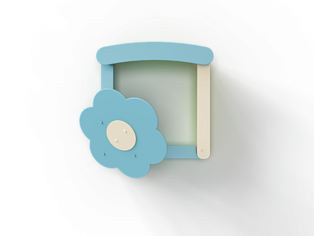 Песочница выполнена из бруса, фанерных стенок, опорных столбов, фанерных накладок-сидений и фанерного навеса в форме ромашки.