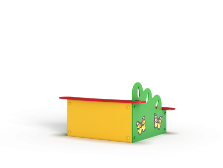 Песочница выполнена из фанерных стенок с художественным оформлением, опорных столбов и фанерных накладок-сидений.