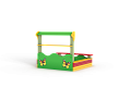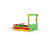 Песочница выполнена из бруса, фанерных стенок с художественным оформлением, опорных столбов, фанерных накладок-сидений и фанерного спойлера.