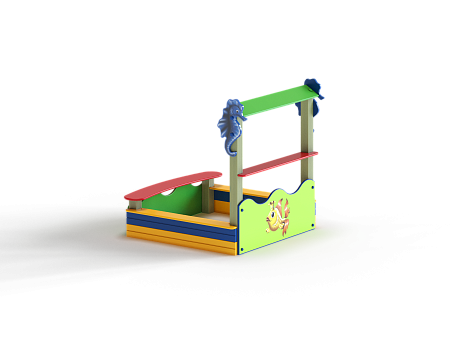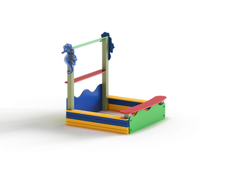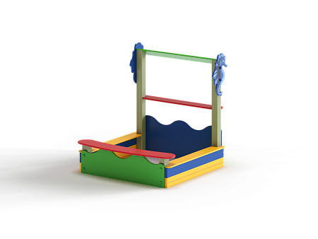 Песочница представлена в морской тематике. Выполнена из бруса, фанерных стенок с художественным оформлением, опорных столбов, фанерных накладок-сидений и фанерного спойлера с фанерными стойками в форме морских коньков.