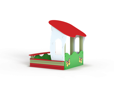 Песочница с навесом выполнена из бруса, фанерных стенок с художественным оформлением, опорных столбов, фанерных накладок-сидений, фанерного навеса.