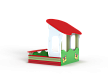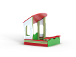 Песочница с навесом выполнена из бруса, фанерных стенок с художественным оформлением, опорных столбов, фанерных накладок-сидений, фанерного навеса.