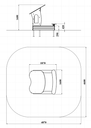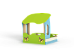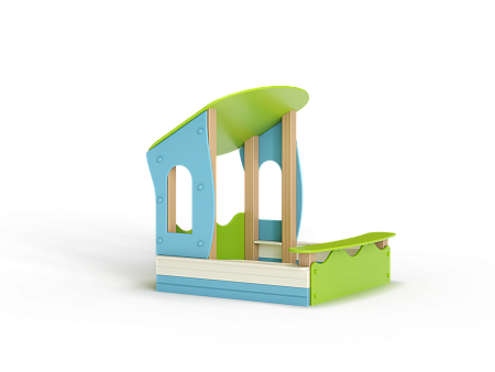 Песочница с навесом выполнена из бруса, фанерных стенок с художественным оформлением, опорных столбов, фанерных накладок-сидений, фанерного навеса.