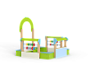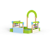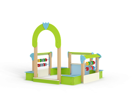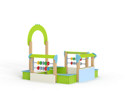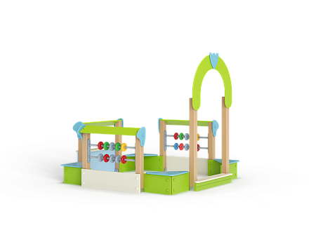 Песочница состоит из столбов с прикрепленными к ним по периметру фанерными ограждениями. Вход в песочницу выполнен в виде декоративной фанерной арки. Между боковыми столбами расположены два комплекта счет с разноцветными пластиковыми бубликами. На столбах установлены три спойлера, один расположен напротив арочного входа, два других на столбах со счетами.