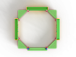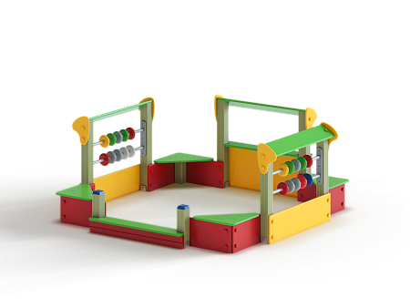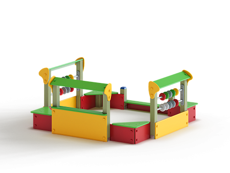 Песочница состоит из столбов с прикрепленными к ним по периметру фанерными ограждениями. Между боковыми столбами расположены два комплекта счет с разноцветными пластиковыми бубликами. На столбах установлены три спойлера, один расположен напротив входа, два других на столбах со счетами.