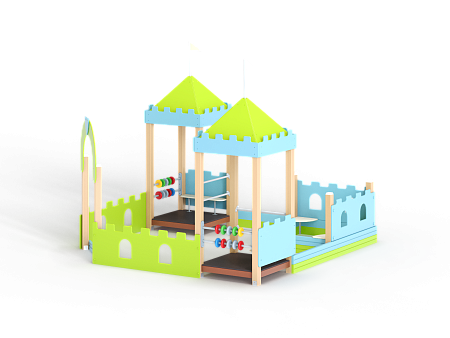 Песочный дворик – модульная конструкция из игровых и развивающих элементов с кремлевской тематикой. Конструкция оборудована двумя башнями беседками, одной аркой, песочницей, ограждением по периметру из деревянного бруса и фанеры. Башни беседки оборудованы крышами, металлическими перекладинами, фанерными ограждениями, детскими счетами с пластиковыми бубликами и сидениями. Песочница с четырьмя фанерными накладками и декоративным фанерным ограждением в наружном углу в форме стен кремля.