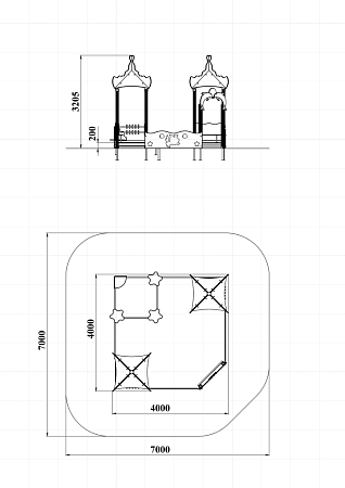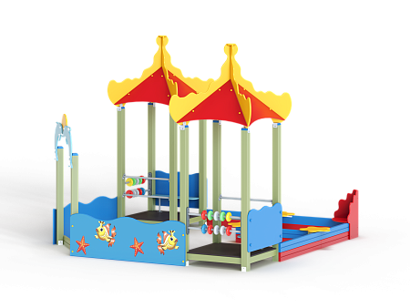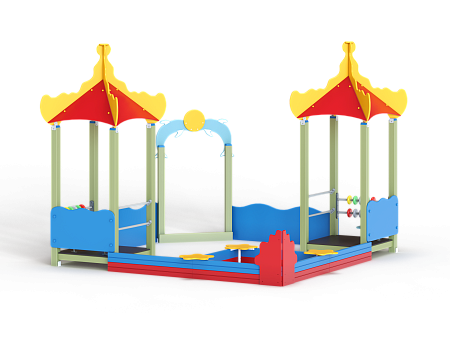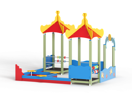 Песочный дворик - модульная конструкция из игровых и развивающих элементов с морской тематикой. Конструкция оборудована двумя башнями - беседками, одной аркой, песочницей и ограждением по периметру из деревянного бруса и фанеры с художественным оформлением. Башни оборудованы крышей, фанерным ограждением и детскими счетами с пластиковыми бубликами. Арка выполнена из фанеры в форме дельфинов с декоративным соединяющим элементом в форме мяча. Песочница с четырьмя фанерными накладками и декоративным фанерным ограждением в наружном углу в форме коралла.