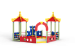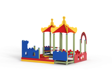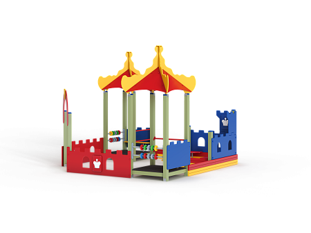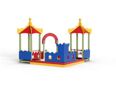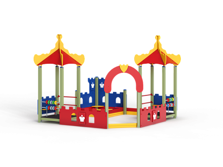 Песочный дворик – модульная конструкция из игровых и развивающих элементов с шахматной тематикой. Конструкция оборудована двумя башнями беседками, одной аркой, песочницей, ограждением по периметру из деревянного бруса и фанеры с декоративными накладками с художественным оформлением. Башни беседки оборудованы крышами, металлическими перекладинами, фанерными ограждениями, детскими счетами с пластиковыми бубликами и сидениями. Песочница с четырьмя фанерными накладками и декоративным фанерным ограждением в наружном углу в форме шахматной фигуры ладья.
