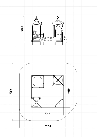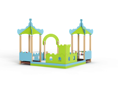 Песочный дворик – модульная конструкция из игровых и развивающих элементов с шахматной тематикой. Конструкция оборудована двумя башнями беседками, одной аркой, песочницей, ограждением по периметру из деревянного бруса и фанеры с декоративными накладками с художественным оформлением. Башни беседки оборудованы крышами, металлическими перекладинами, фанерными ограждениями, детскими счетами с пластиковыми бубликами и сидениями. Песочница с четырьмя фанерными накладками и декоративным фанерным ограждением в наружном углу в форме шахматной фигуры ладья.