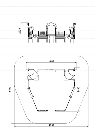 Песочный дворик – модульная конструкция из игровых и развивающих элементов с морской тематикой. Конструкция оборудована двумя песочницами, одной аркой и ограждением из бруса и фанеры по периметру. Песочницы оборудованы навесами, декоративными фанерными флажками, ограждениями, два из которых имеют круглый вырез в виде иллюминатора и фанерные накладки. По периметру дворика расположены детские счеты с пластиковыми бубликами, сидения, арка в виде дельфинов с декоративным соединяющим элементом из фанеры в виде мяча, спойлеры с накладками в виде морских коньков с художественным оформлением.