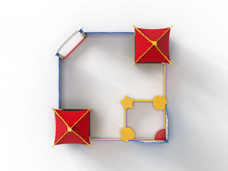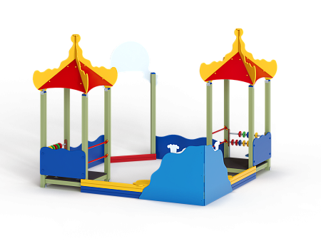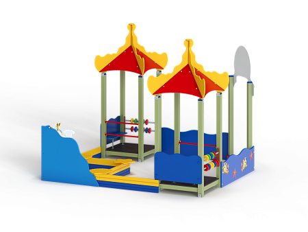 Песочный дворик - модульная конструкция из игровых и развивающих элементов с морской тематикой. Конструкция оборудована двумя башнями - беседками, одной аркой, песочницей и ограждением по периметру из деревянного бруса и фанеры с художественным оформлением. Башни оборудованы крышей, фанерными ограждениями и детскими счетами с пластиковыми бубликами. Арка выполнена из фанеры в форме золотой рыбки с художественным оформлением. Песочница с четырьмя фанерными накладками и декоративным фанерным ограждением в наружном углу в форме морской волны с художественным оформлением в виде золотых рыбок.