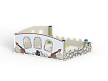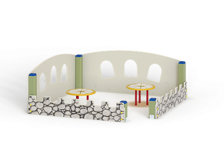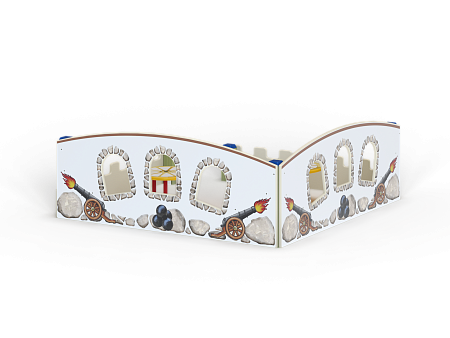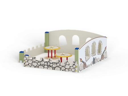 Песочница с художественным оформлением стилизованым под битву при Бородино, состоит из столбов с прикрепленными к ним по периметру фанерным ограждением Внутри песочницы установлены два круглых столика на металлических ножках.