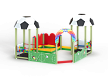 Песочный дворик – модульная конструкция из игровых и развивающих элементов с футбольной тематикой. Конструкция оборудована двумя башнями беседками, одной аркой, песочницей, ограждением по периметру из деревянного бруса и фанеры с художественным оформлением. Башни беседки оборудованы крышами в виде половинок футбольного мяча, металлическими перекладинами, фанерным ограждением, детскими счетами с пластиковыми бубликами и сидением. Песочница с четырьмя фанерными накладками и декоративным фанерным ограждением в наружном углу.