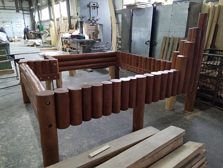 Второй — деревянные столбы и брёвна выполнены из клееной сосновой древесины с последующим оцилинриванием, имеет ровную цилиндрическую поверхность.