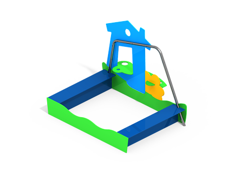 Песочница выполнена в виде избушки с бортами из HPL пластика и нержавеющего металла.