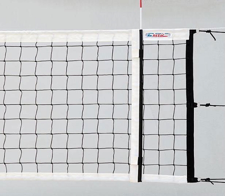Волейбольная сетка с четырьмя подвязками и п/э тросом. Выполнена из полипропилена, толщина нити составляет 2,6 мм. Нижняя и верхние стропы широкие — 50 и 100 мм соответственно. Стропы 100 и 50 мм, сложенные пополам