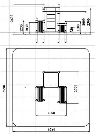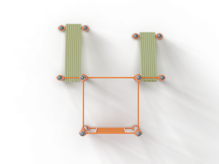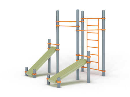Воркаут состоит из десяти несущих столбов, девяти перекладин и двух скамей из бруса с зажимными хомутами.