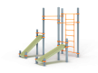 Воркаут состоит из десяти несущих столбов, девяти перекладин и двух скамей из бруса с зажимными хомутами.