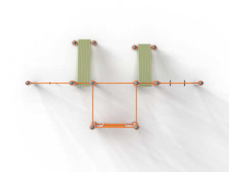 Воркаут состоит из двенадцати несущих столбов, девяти перекладин, перекладины с канатом, перекладины с гимнастическими кольцами, шведской стенки и двух наклонных скамей из бруса с зажимными хомутами.