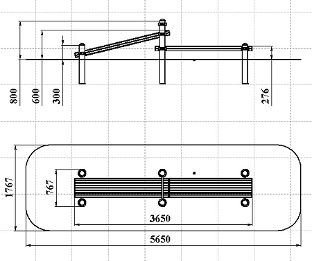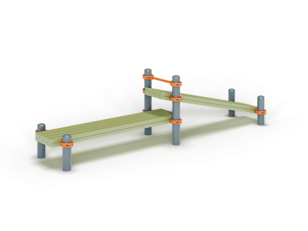 Воркаут состоит из шести несущих столбов, пяти перекладин и двух скамей из бруса (одна наклонная) с зажимными хомутами.