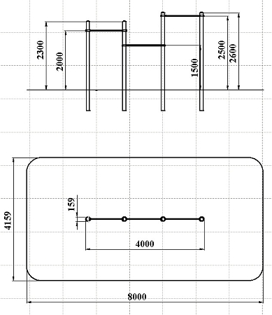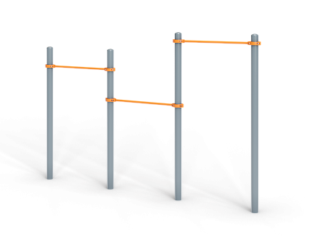 Воркаут состоит из четырех несущих столбов и трёх перекладин с зажимными хомутами.