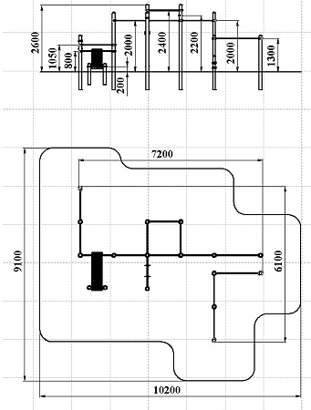 Воркаут состоит из семнадцати несущих столбов, четырнадцати перекладин, перекладины с гимнастическими кольцами, шведской стенки и наклонной скамьи из бруса с зажимными хомутами.
