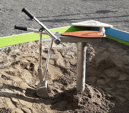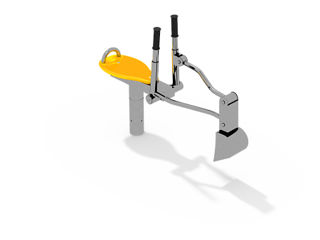 Тренажер имитирует работу ковша экскаватера, зачерпывая и сбрасывая сыпучий груз вокруг себя за счет кругового движения вокруг своей оси. Тренажер развивает координацию и моторику рук. Все металлические элементы и метизы тренажера изготовлены из нержавеющей стали
