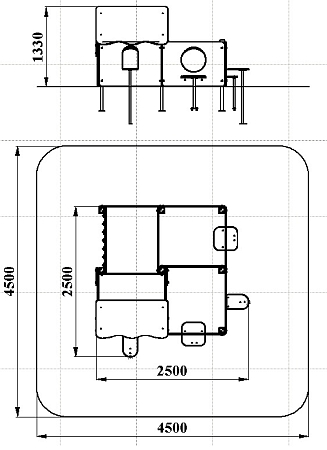 Лабиринт состоит из четырех секций (одна из них с крышей) разделенных фанерными ограждениями с круглыми и арочными лазама. Со стороны улицы крепятся столики и ступеньки.