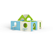 Лабиринт состоит из четырех секций (одна из них с крышей) разделенных фанерными ограждениями с круглыми и арочными лазама. Со стороны улицы крепятся столики и ступеньки.